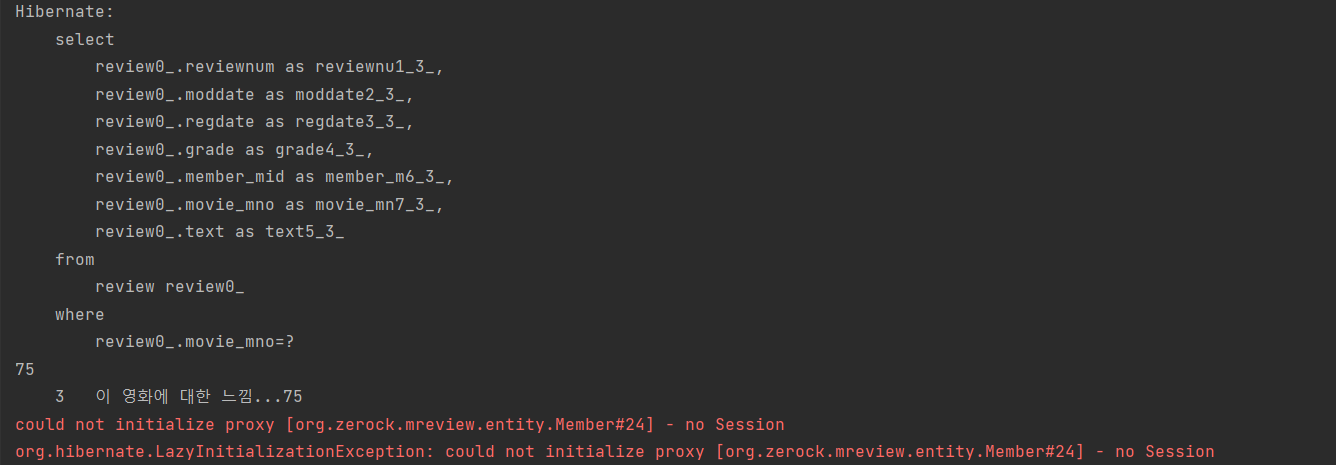 이는 Review에서 Member가 LazyLoding으로 참조하고 있기 때문에 Member 객체를 조회할 수 없기 때문에 발생한다.