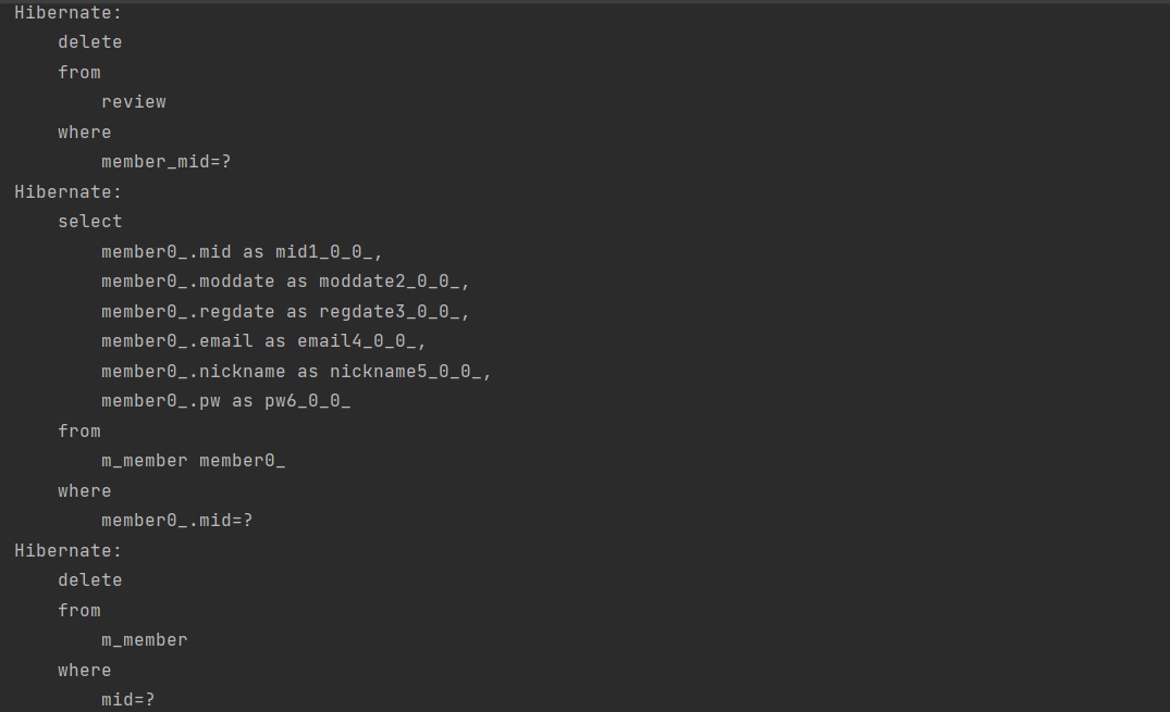 위의 예제에서 특정한 회원(Member)을 삭제하는 경우 해당 회원이 등록한 모든 리뷰(Review)역시 삭제 되어야 하기 때문에, review 테이블에서 먼저 삭제하고, member 테이블에서 삭제해야 한다.