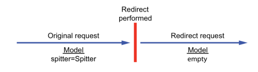 위 방식처럼 spitter 라는 객체를 Redirect 방식으로 넘겨주려고 할때, 리다이렉트가 발생하면 원래 요청은 끊어지고, 새로운 HTTP GET 요청이 시작된다.