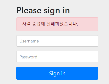 이제 프로젝트를 실행해서 웹 브라우저에서 잘못된 계정을 이용하게 되면