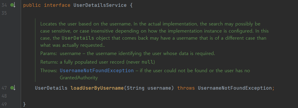 UserDetailsSerivce 는 위와 같이 loadUserByUsername() 이라는 단 하나의 메서드를 가진다.