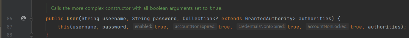 User 클래스를 살펴보면 별도의 처리 없이 생성자에 몇 가지 정보를 전달하는 것으로 충분하다.