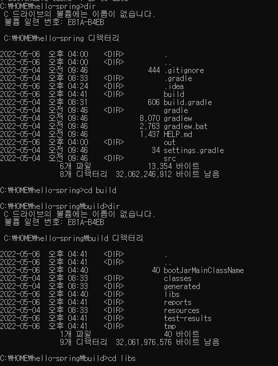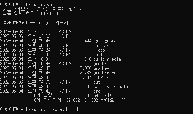 dir명령어로 목록확인 후 gradlew파일을 확인한 후