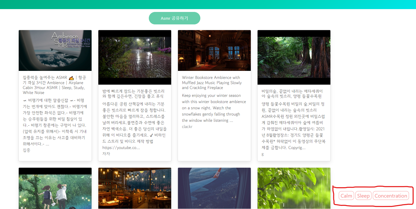 따라서 위의 내용을 착안하여, 조금 신박한 주제를 찾다가 요즘 asmr종류가 다양해진 것 같아, 조원들에게 "저흰 asmr추천 해주는 사이트 어떠세요?"라고 물어봤는데 모두 찬성하여 바로 프로젝트에 돌입하게 되었다.
