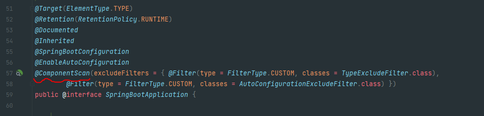 여기서 @SpringBootApplication이 있다면 해당 어노테이션의 default값으로 해당 어노테이션이 들어있는 패키지가 자동으로 ComponentScan으로 등록된다. 위의 @SpringBootApplication을 Ctrl+클릭해보면