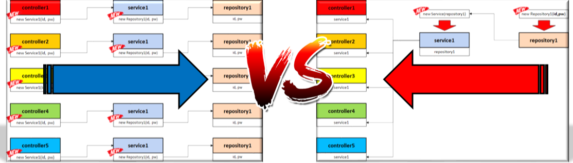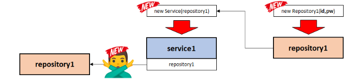 위 그림에선 service1에서 repository1 객체를 생성하는것은 절대 안된다고 표현하고있다. repository1객체는 Repository1클래스를 가르키고있고, 단지 Service객체를 생성할때 매개변수에 repository1를 주입하고있다.