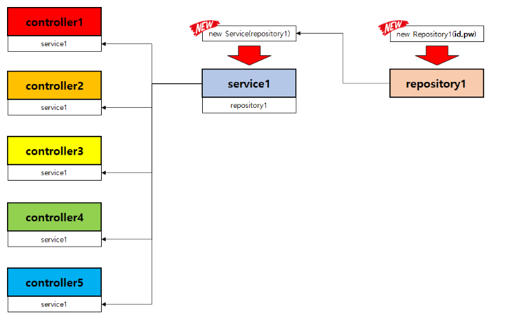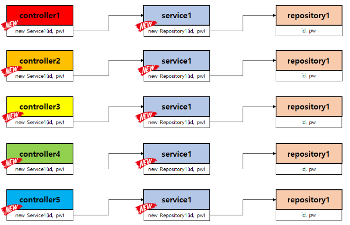 만약 Controller가 5개가 있고 모두 Service1을 생성하여 사용 중이라고 가정하면 Repository1 생성자 변경에 의해 모든 Controller와 모든 Service 의 코드 변경이 필요하다.