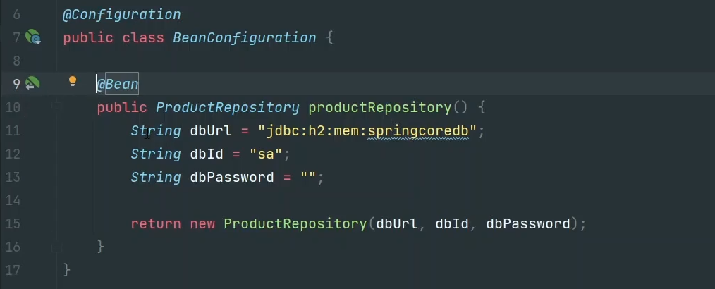 여기서 스프링 '빈'이름은 @Bean이 설정된 함수명이며 첫글자를 소문자로 취급하여 넣어준다.(위에선 productRepository)