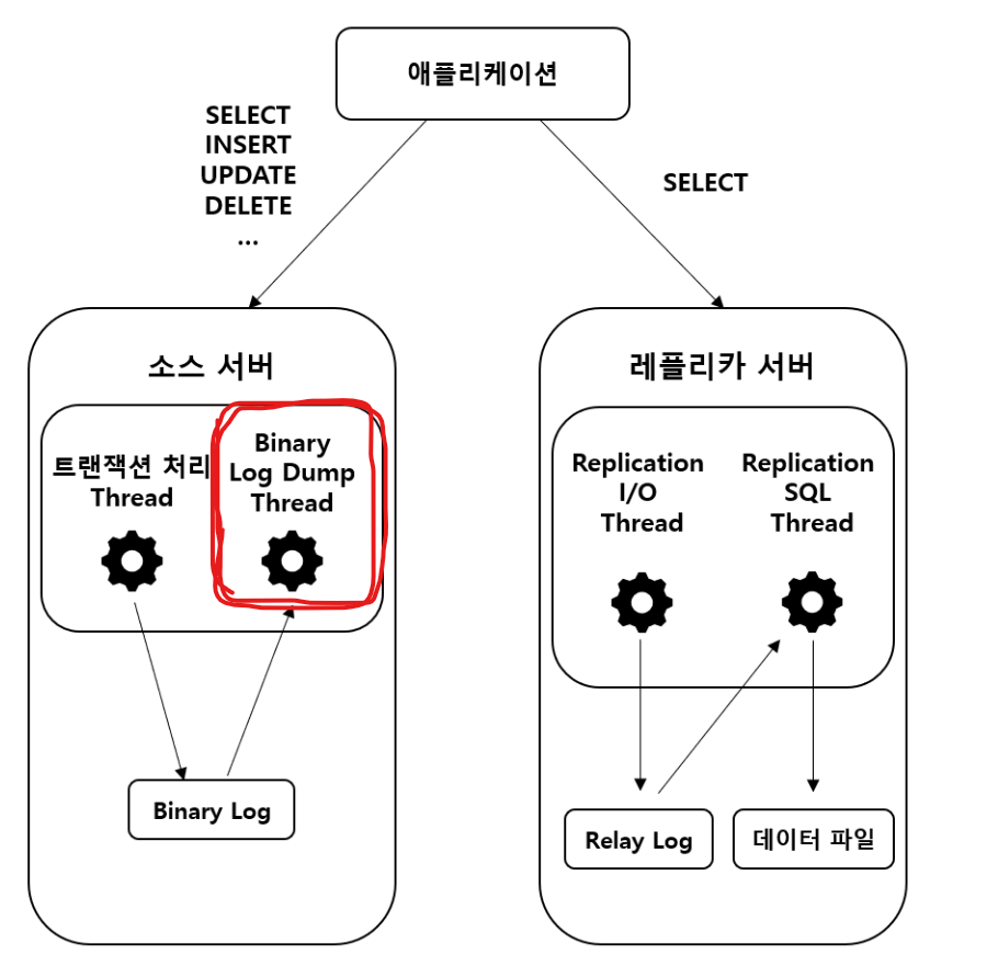 레플리카 서버가 소스서버에 연결되면 소스서버에서 내부적으로 Binary Log Dump Thread를 생성하게 된다.