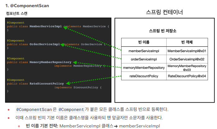 @ComponentScan은 @Component가 붙은 클래스를 스캔하기 때문에 스프링 빈으로 사용할 클래스에 @Component를 붙여준다.
