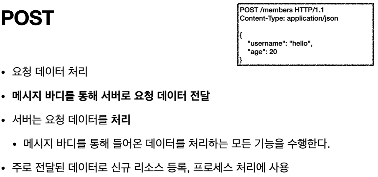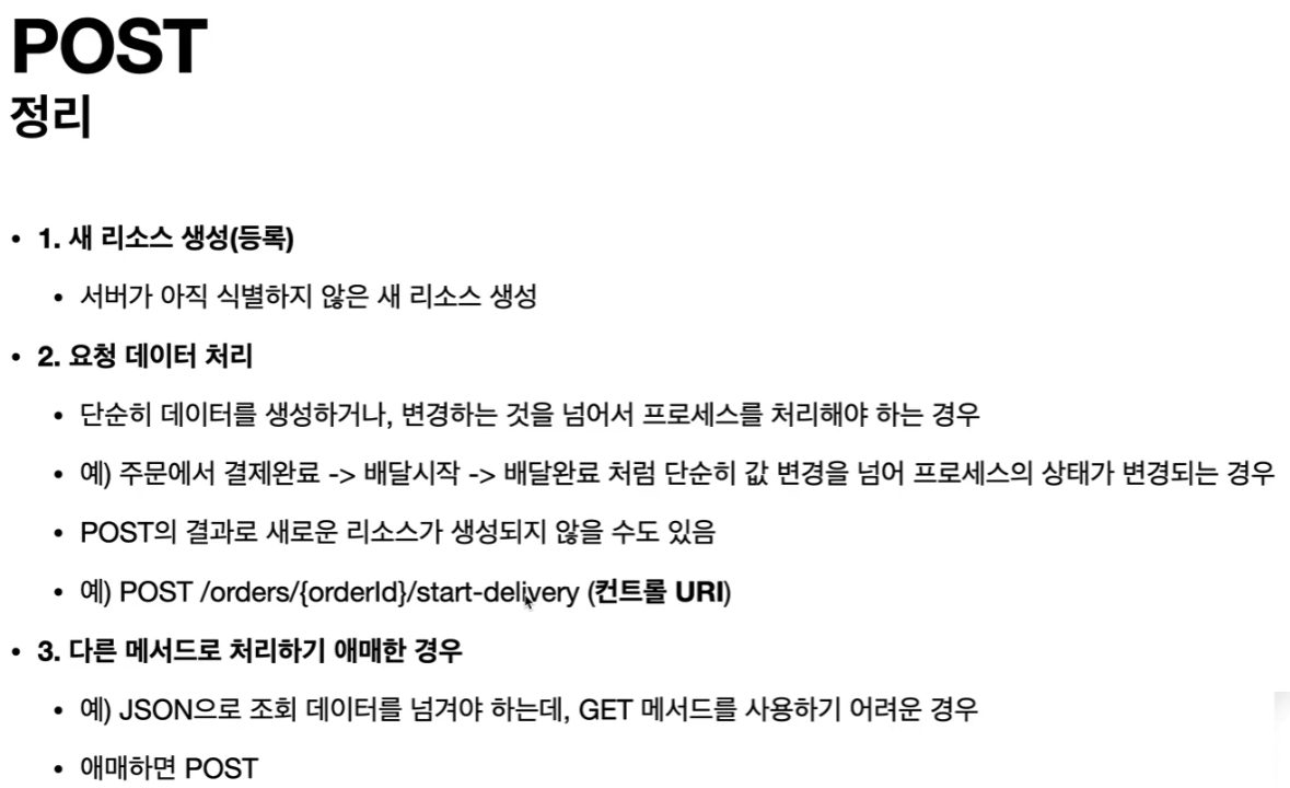 POST메서드는 스펙상 "대상 리소스가 고유 한 의미 체계에 따라 요청에 포함 된 표현을 처리하도록 요청"한다고 명시되어있다. 정리하자면 아래와 같은 곳에서 사용된다.