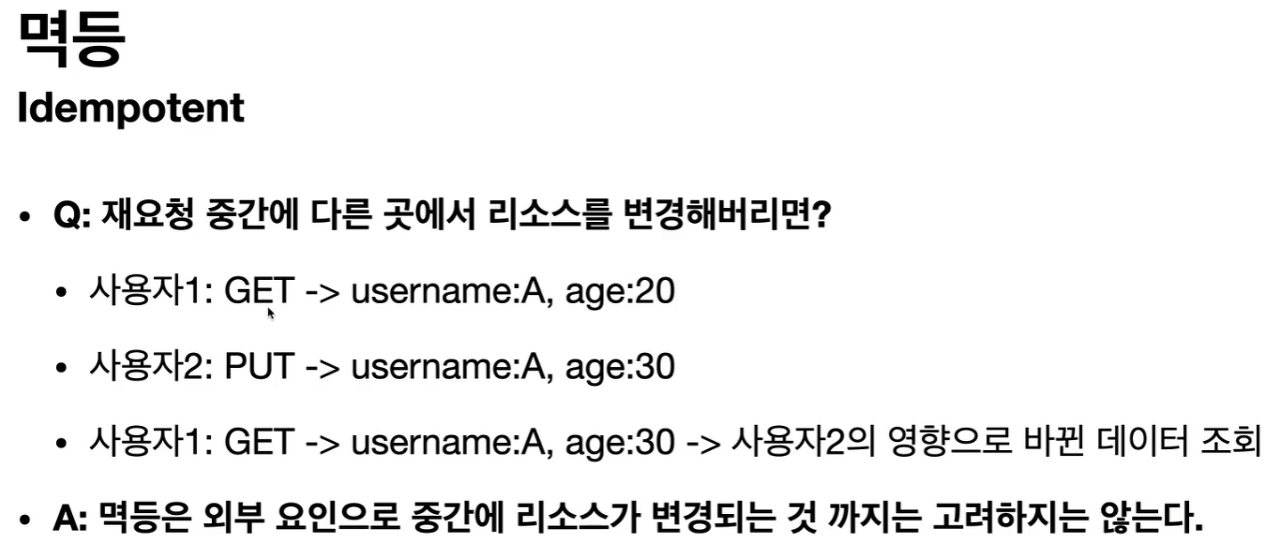 멱등은 자동 복구 메커니즘으로 활용할수있다. 예를들어 DELETE로 서버를 호출했는데 서버에서 응답이 없다고 가정할때, 클라이언트는 다시 자동으로 DELETE를 재시도한다. 이것이 가능한 이유는 멱등하기 때문에 똑같은 요청을해도 상관이 없다. 실제 개발에서 이런 매커니즘이 많이 사용된다고 한다.