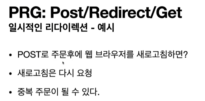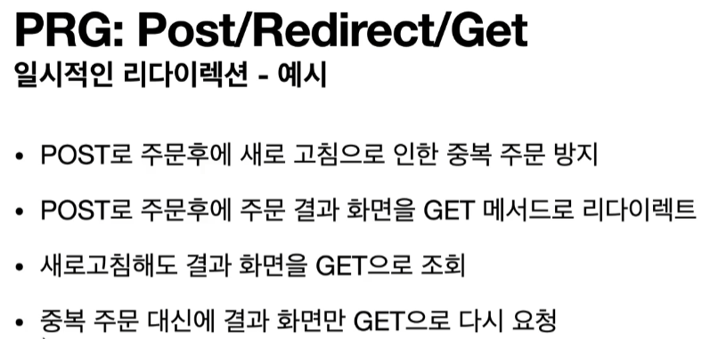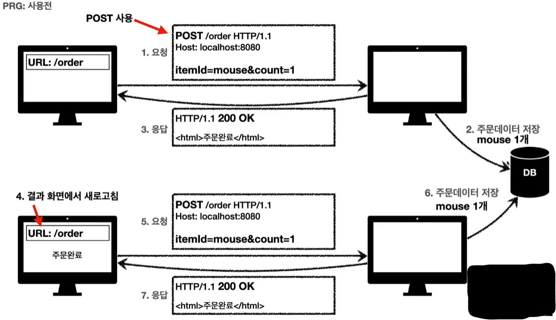 먼저 POST로 주문요청을 보낸후, 응답으론 3xx을 이용하여 redirect시키게 한다. 그후 GET을 사용하여 재요청하고 다시응답하게되면 사용자는 결과 화면에서 새로고침을 해도 결과 화면만 보이게 된다.