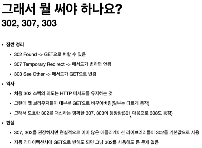 처음 302 스펙의 의도는 HTTP메서드를 유지하는 것이였지만 웹 브라우저 대부분이 GET으로 바꾸어 버리기 때문에 명확한 307,303이 등장하였다. 따라서 이를 쓰는것을 권장하지만 이미 많은 애플리케이션이 302를 기본값으로 사용하기에 자동 리다이렉션시 GET 으로 변경되는 경우 302를 사용해도 큰 문제는 없다.