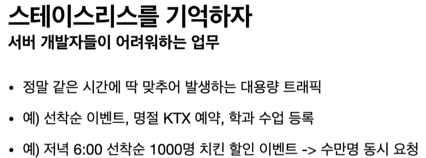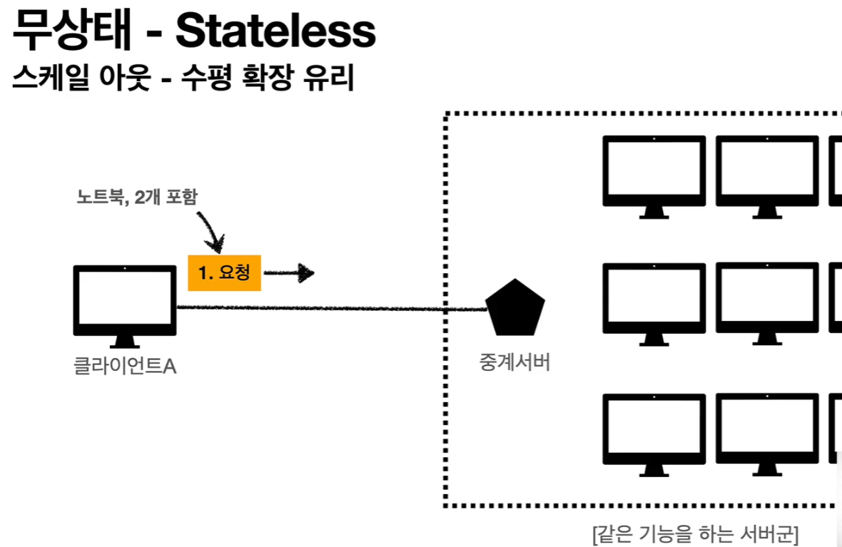 Stateless(무상태)는 중간에 다른 점원으로 변경되어도 된다. 예를들어 고객이 막 증가하여도 점원을 대거 투입할수있다.즉, 갑자기 클라이언트 요청이 증가하여도 서버를 대거 투입(증설)할수있다.