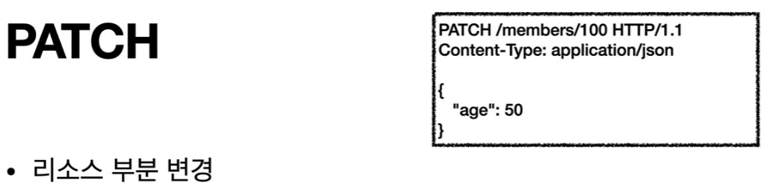 /members/100 라는 리소스의 내용이 { "age":20 , "username":"hun" } 일때, 클라이언트에서 { "age":"50" }으로 요청한다면username은 그대로 남아있고 age만 50으로 변경된다.