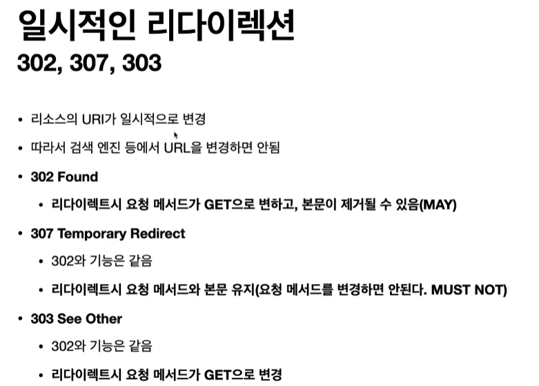 307은 요청 메서드와 본문을 유지하고, 303은 GET으로 변경되어 명확하게 구분되지만 실무에선 302를 대부분 사용한다.(과거잔재)