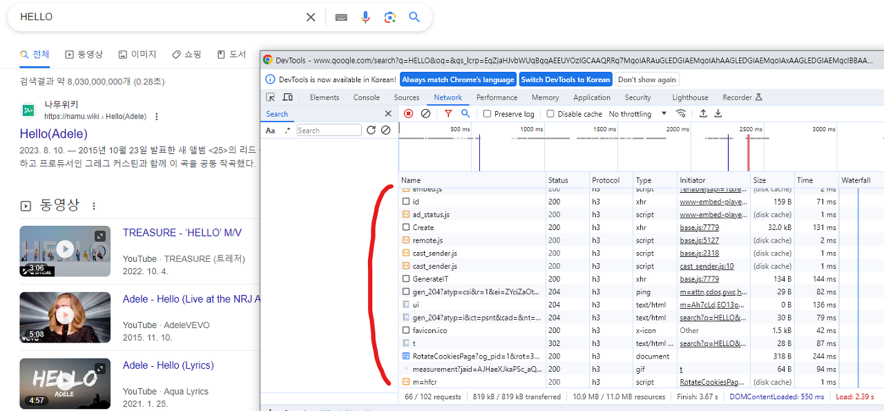 예를들어 아래와 같이 실제로 구글에 검색을 하게되면 아래와 같이 수많은 자원이 다운로드 되는것을 확인할 수 있다.