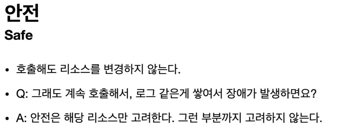 GET메서드의 경우는 단순 조회만 하기때문에 안전하다고 볼 수있다. 역으로 위에서 언급한 나머지 메서드들은 안전하지않다. Q와 같이 질문이 들어온다면 안전이라는 속성은 해당 리소스만 고려하기 때문에 복잡하게 생각할 필요가 없다.