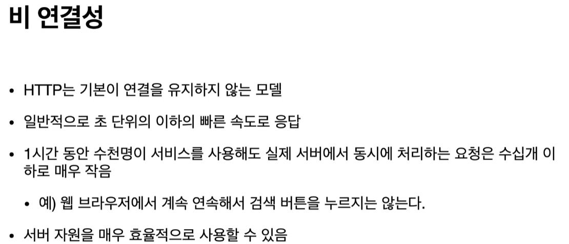 HTTP는 연결을 유지하지 않기 때문에 매우 빠른속도로 응답하며 서버 자원을 효율적으로 사용할 수 있다.