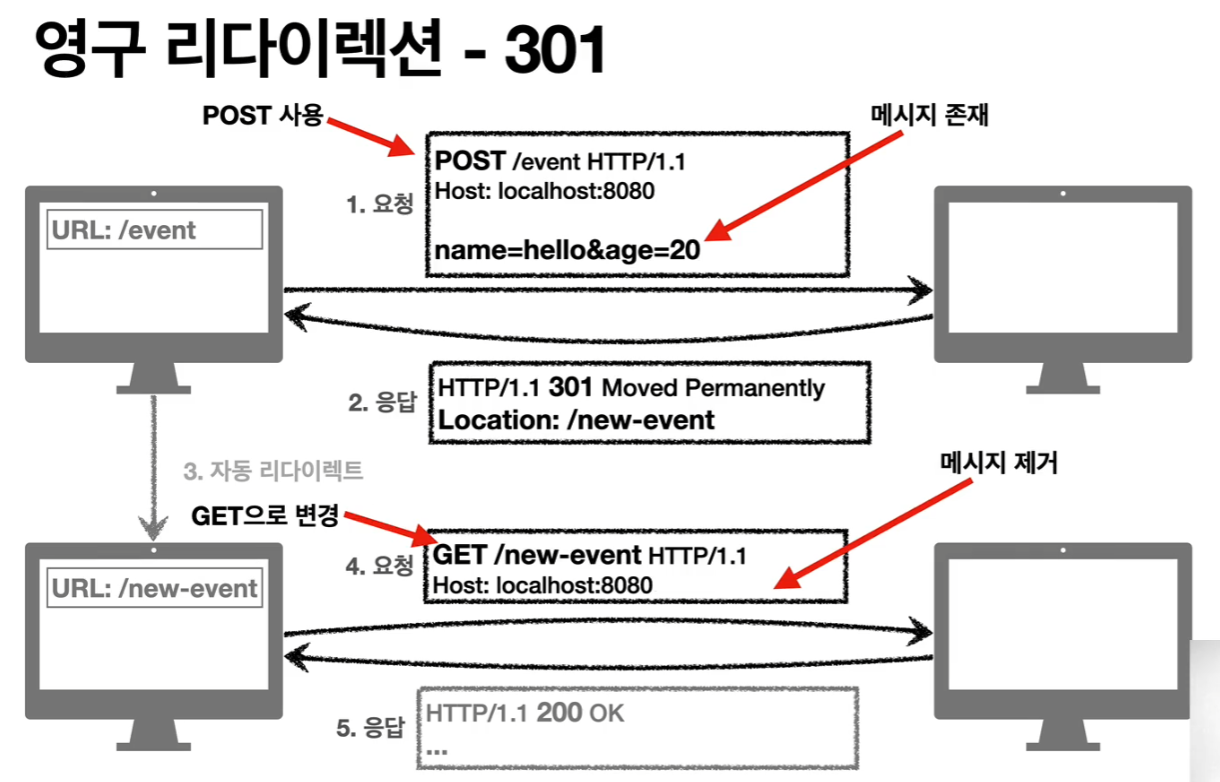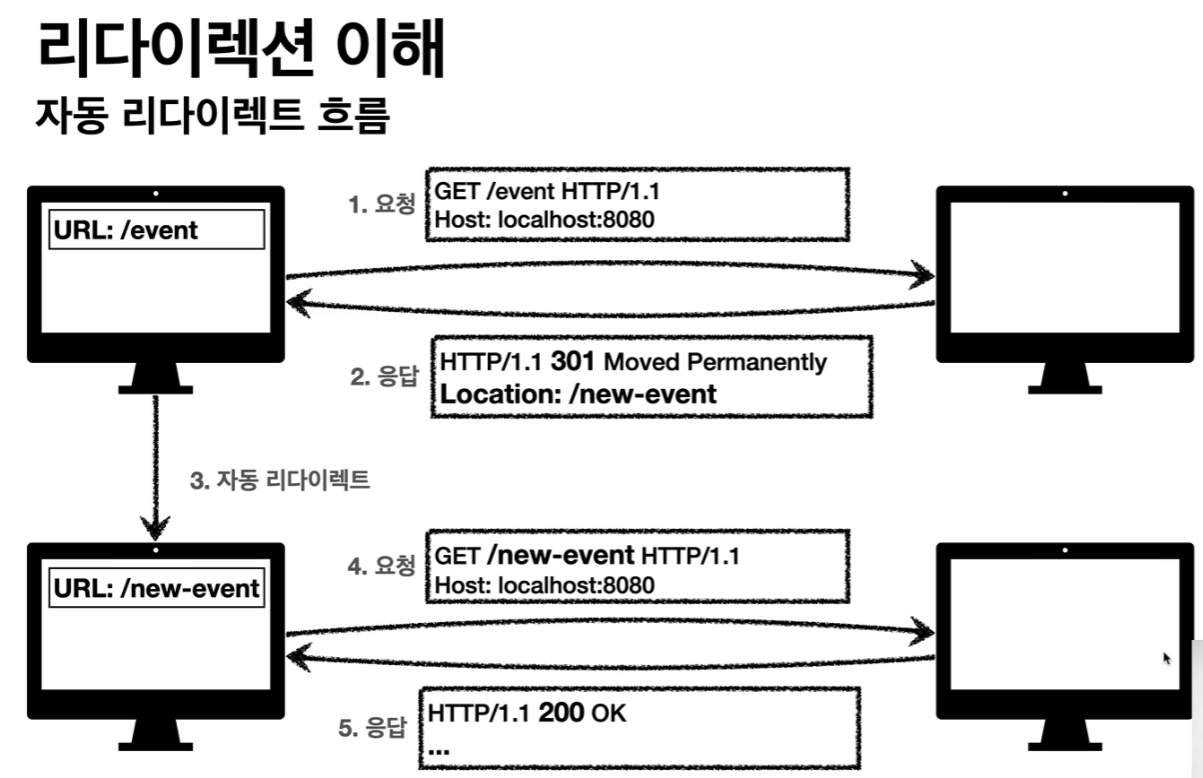 /event로 요청이오면 서버에선 3xx메시지와 함께 HTTP response헤더에 Location을 실어주고, 웹 브라우저에선 자동으로redirect된다.