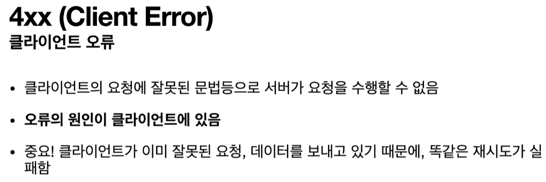 예를 들어 서버 요청시 그 시점에 db시스템에 문제가 생겨 5xx문제가 생긴후 나중에 db시스템이 복구되어 5xx문제가 해결될 수 있는 반면 4xx오류는 클라이언트에 있기에 문제가 해결될 수 없는 차이점이 있다.