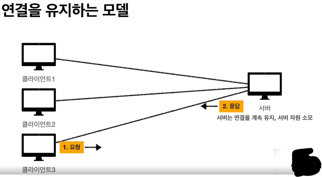 만약 연결을 유지하는 모델이라면 서버는 클라이언트1,2의 요청후 3의 요청을 응답할때도 1,2를 여전히 유지하기 때문에서버에 과부하를 줄일수있다.