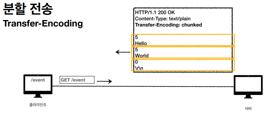만약 클라이언트에서 헤더에 Transfer-Encoding을 설정하여 서버에 전송하였다면 서버는 위와 같이 각각 끊어서 보내게 된다.