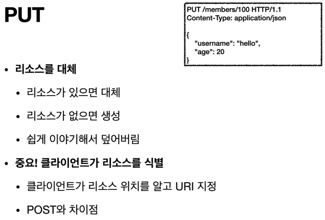 예를들어 서버에 /members/100 라는 리소스의 내용이 { "age":20 , "username":"hun" } 일때, 클라이언트에서{ "age":"50" }으로 요청한다면 username은 사라지고 age가 50으로 대체된다.