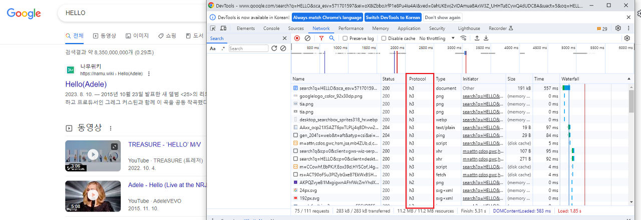 실제로 구글에 어떤 검색어를 입력하고 관리자 모드를 보면 Protocol에 http버전을 확인할 수 있다.