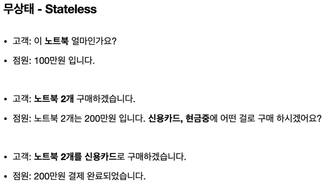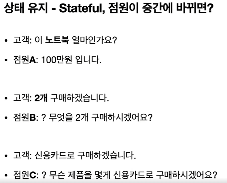 무상태는 고객이 필요한 데이터를 그때그때 다 넘겨주기 때문에 중간에 점원이 변경되어도 자연스럽게 흘러가는 것을 볼수있다.