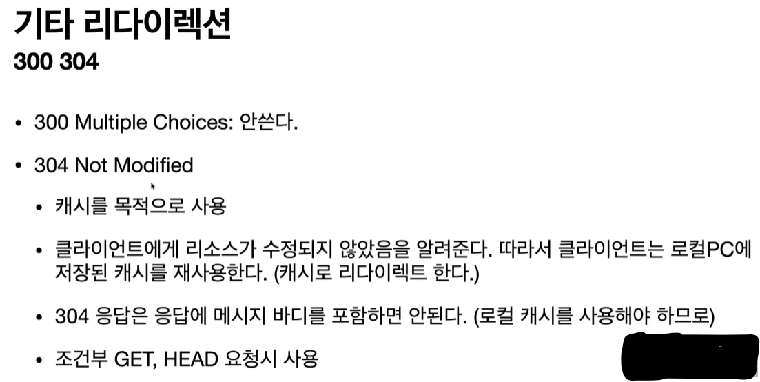 304는 굉장히 많이 사용되며, 캐시로 리다이렉트 함을 의미한다.304는 로컬 캐시를 사용해야 하기때문에 응답에 Body를 포함하면 안된다.