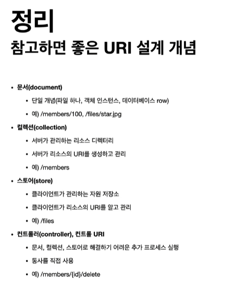 2번의 예시와 같이, 리소스로만 URI를 설계할 수 없는경우 직접 동사를 넣기도한다. 이때, 이 동사를 컨트롤URI라고 부른다. URI를 설계할땐 기본적으로 리소스로 최대한 URI를 설계하되 어쩔 수 없는 부분들은 컨트롤URI를 사용하도록 한다.