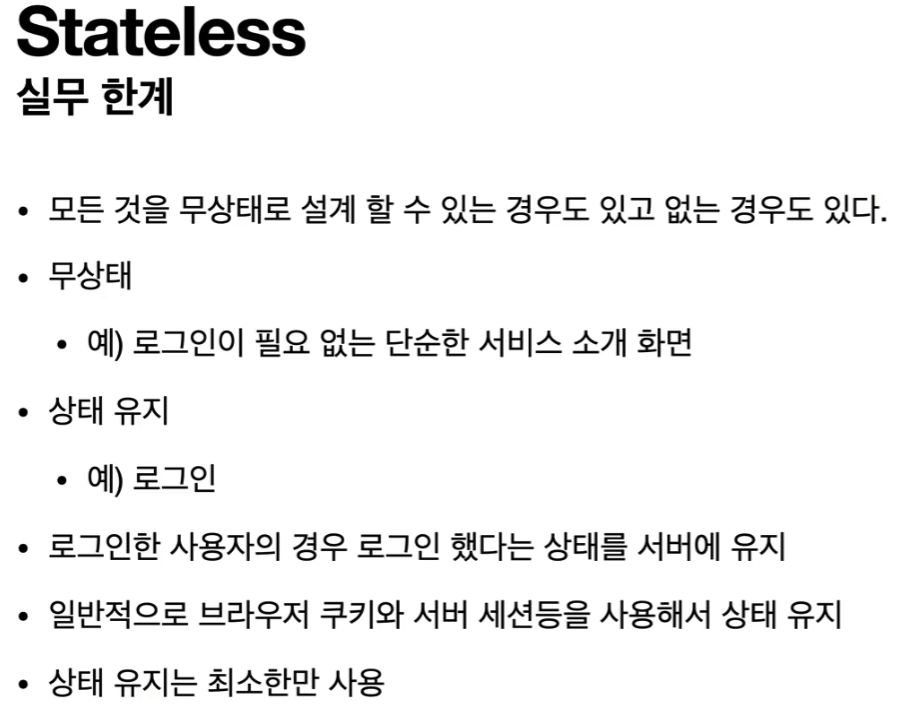 실무에선 모든 것을 무상태로 설계할수는 없기 때문에, 쿠키와 서버 세션등을 이용하여 상태를 유지한다.