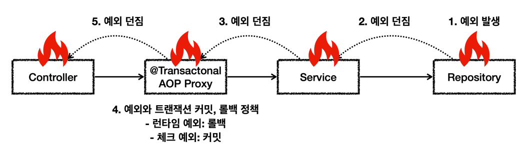만약 @Transactional가 적용된 AOP밖으로 예외가 던져지면 예외의 종류에 따라 트랜잭션을 커밋하거나 롤백한다.