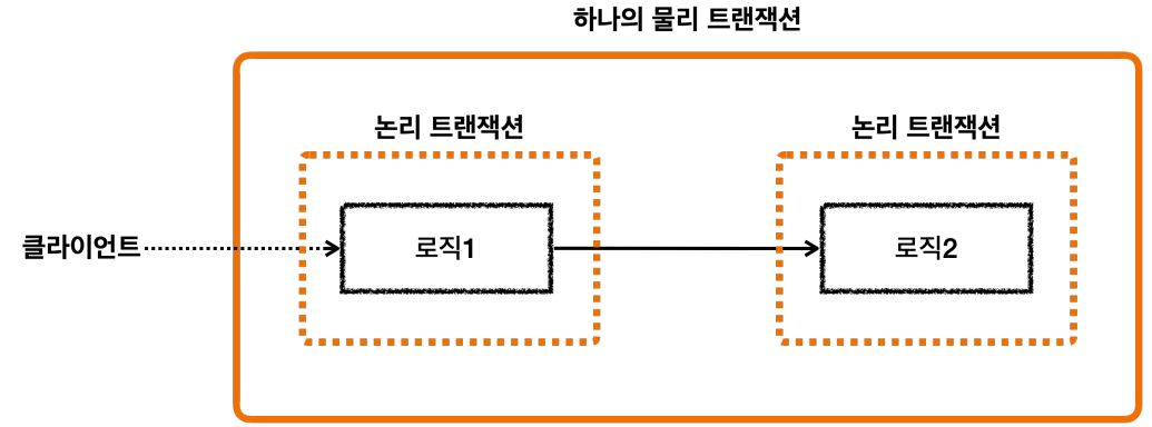 A클래스의 메서드(로직1)에서 트랜잭션을 시작하고 트랜잭션이 유지되고 있는 상태에서 B클래스의 메서드(로직2)의 트랜잭션이 시작된다.