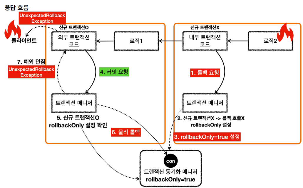 이후 로직1에서 커밋이 될 때, 트랜잭션 동기화 매니져에있는 rollbackOnly 설정이 true인것을 확인하고 rollback을 호출하게 되며 스프링은 UnexpectedRollbackException 예외를 던진다.
