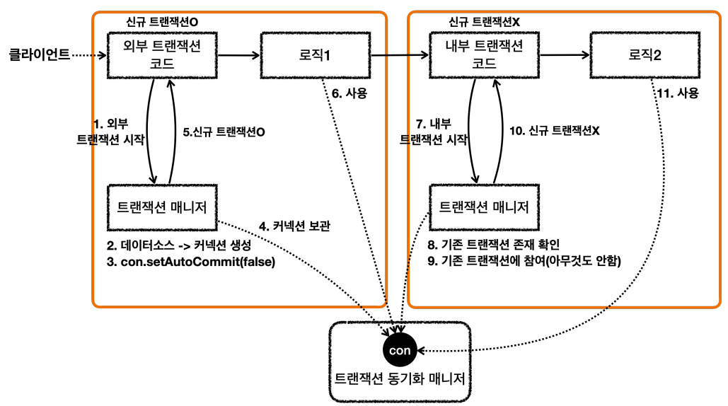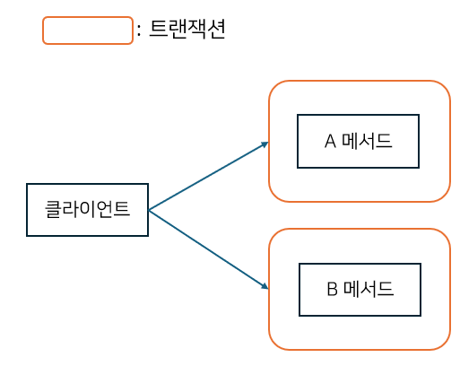 1.A클래스의 메서드에서 트랜잭션을 시작하여 B클래스의 메서드를 호출한다.