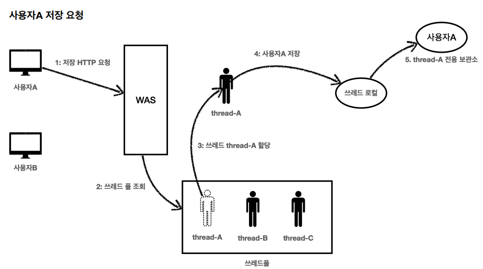 사용자 B의 요청이 들어오면 WAS는 쓰레드 풀에서 쓰레드를 하나 조회하는데 여기서 만약, 쓰레드A가 할당된다면,