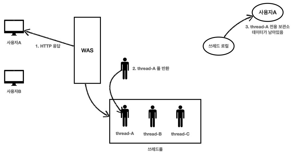 여기서 쓰레드A는 쓰레드풀에 아직 살아있기 때문에, 쓰레드 로컬의 쓰레드A 전용 보관소에 사용자A 데이터도 함께 살아있게 된다.