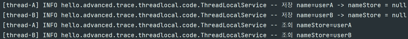 조회할때도 마찬가지로 thread-A가 조회한다면 쓰레드 로컬은 thread-A 전용 보관소에서 userA 데이터를 반환해준다.
