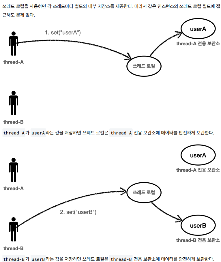 그러나, 쓰레드 로컬을 사용하면 각 쓰레드마다 별도의 내부 저장소를 제공하게 되어 위같은 상황이 발생하지 않는다.