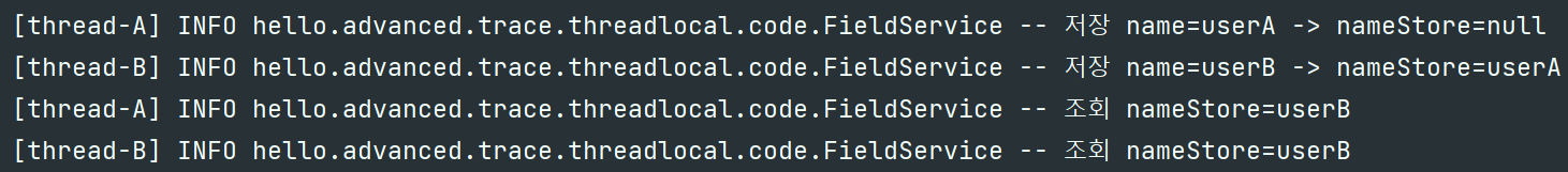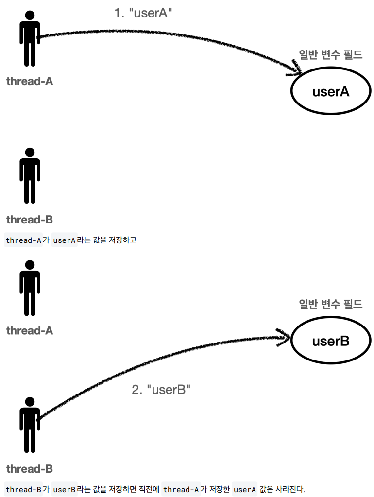 일반 변수 필드는 thread-B가 요청한 순간 필드값 변경요청으로 인해 userA값이 사라진다.
