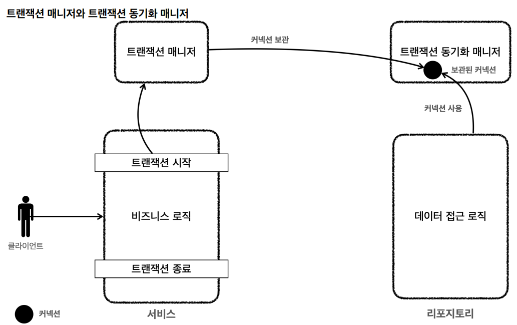 스프링 DB정리 포스팅에서 트랜잭션 매니져에 관한 설명으로 아래 그림을 예시로 든적이 있다.