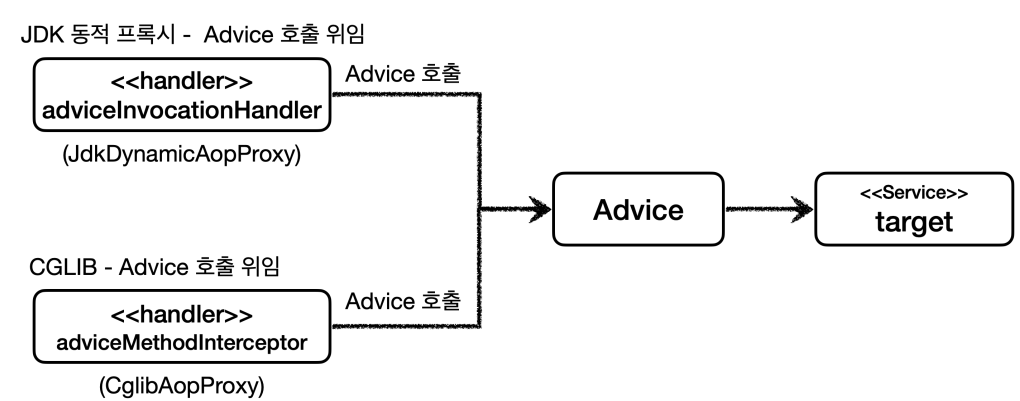JDK동적 프록시에선 InvocationHandler를 구현하여 내부에 부가기능을 추가하였고, CGLIB는 MethodInterceptor를 구현하여 부가기능을 추가하였다. 그런데 이처럼 인터페이스에는 JDK 동적 프록시를 써야하고 없을땐 CGLIB를 써야한다면 중복으로 관리되어 불편할 것이다.