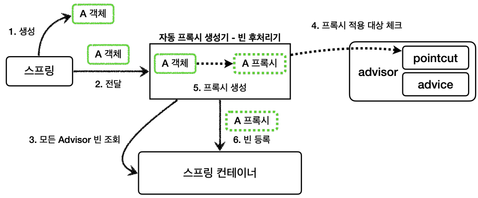 - 프록시 적용 대상 여부를 체크해서 꼭 필요한 곳에만 프록시 적용 ( 빈 후처리기 - 자동 프록시 생성 )