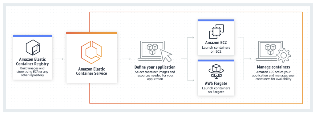 위 사진은 ECS가 EC2와 Fargate 두 가지 Launch Type을 이용하여 컨테이너를 관리해주는 모습을 나타낸다.