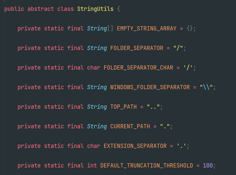 💡참고로 Spring 대부분의 유틸리티 클래스는 방법2가 적용되어 있지 않고, 방법1의 abstract로 인스턴스화를 막고 있다. 아래는 Spring에서 지원하는 StringUtils 클래스이다.