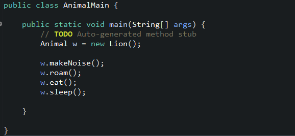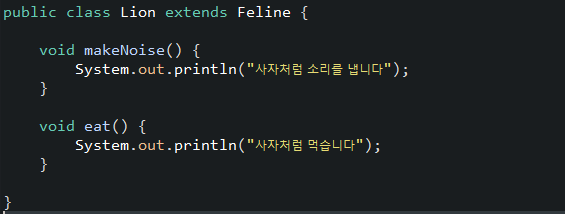 그후 실행결과로 보면 Lion 클래스에 있는 메소드를 직접가져와 사용했다.