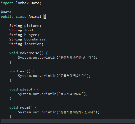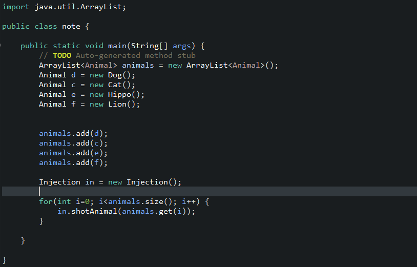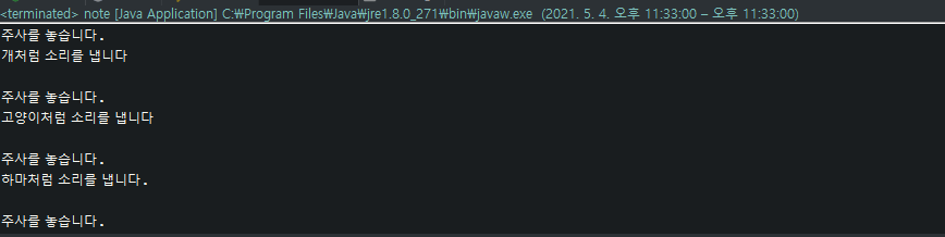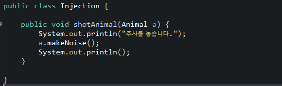 위의 예제는 Injection 클래스에 있는 shotAnimal 메서드를 이용하여 "주사를 놓습니다" 코멘트와 각각의 makenoise()를